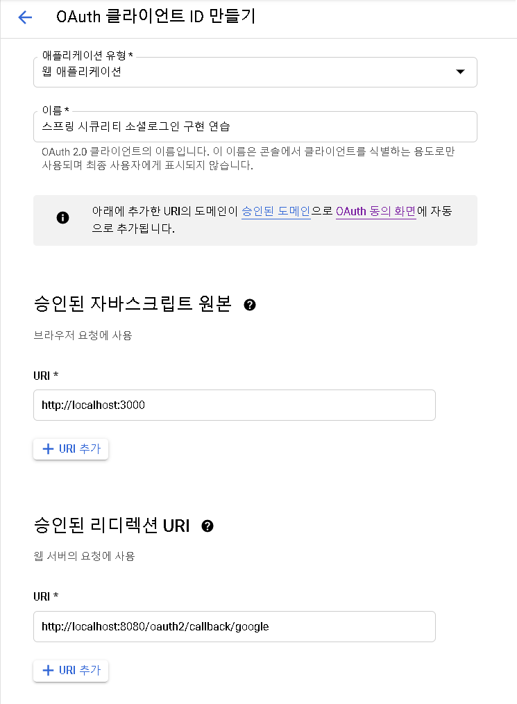 OAuth 클라이언트 ID를 만들어줍니다.