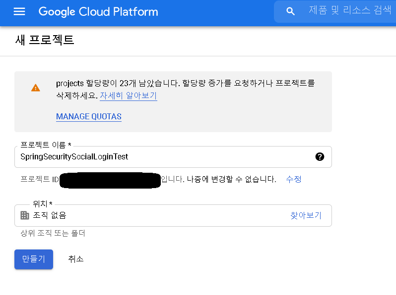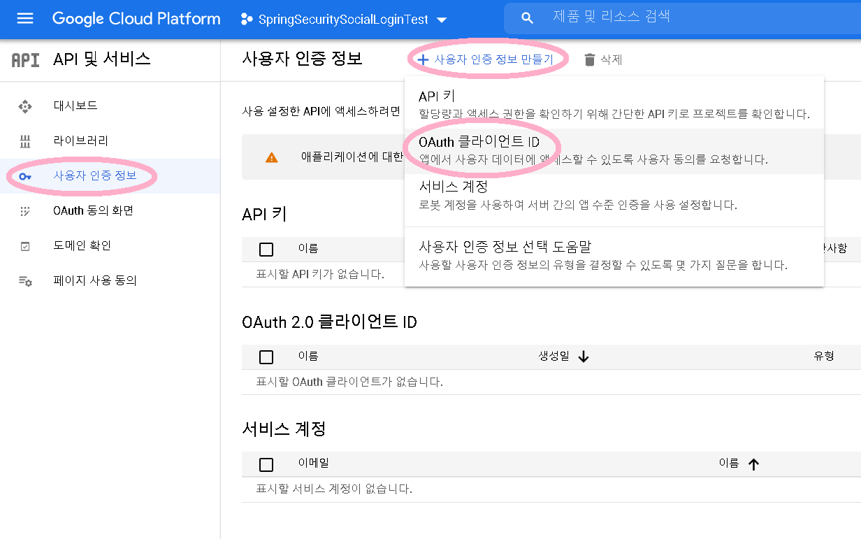 이제 다시 OAuth 클라이언트 ID 만들기를 시도해보겠습니다.