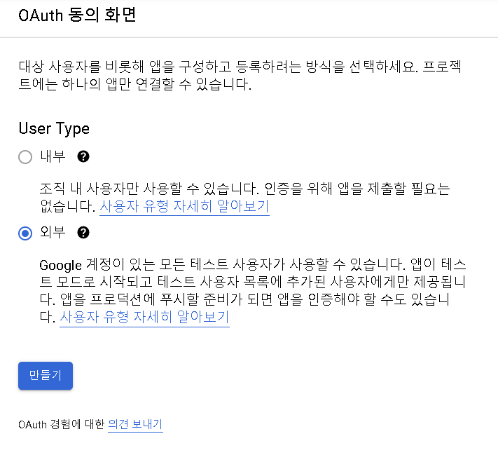 저는 누구나 소셜로그인을 통해 사용할 수 있는 웹 사이트를 만들것이기 때문에 [외부]를 선택했습니다.