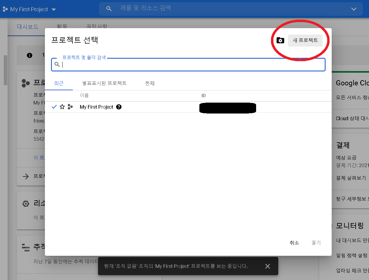 구글 API 콘솔에서 새 프로젝트를 생성합니다.