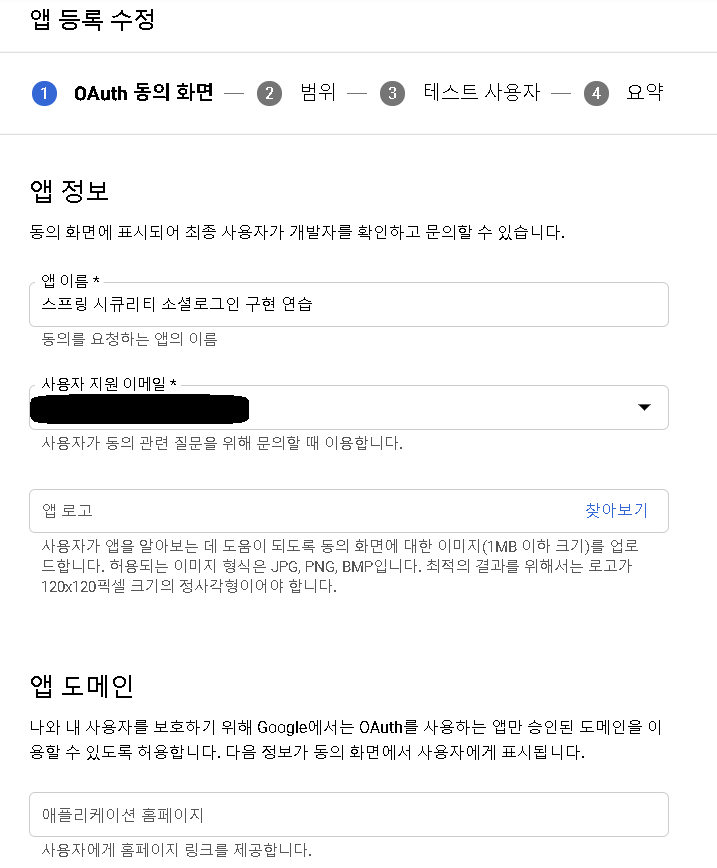 앱 도메인, 앱 로고, 승인된 도메인, 뭐시기뭐시기 등 물어보는게 많은데